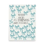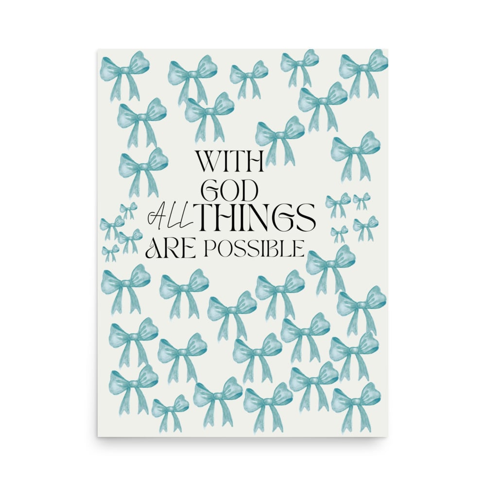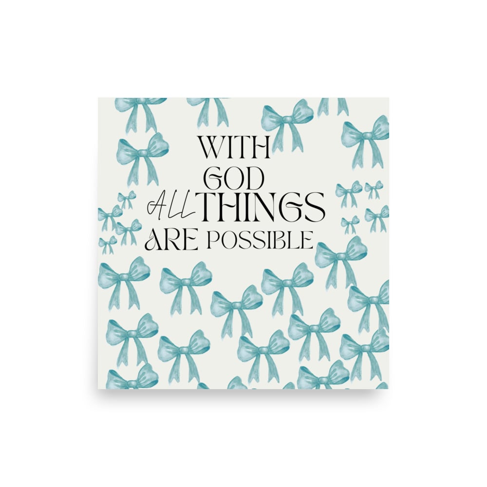 Matthew 19:26 With God All Things Are Possible” blue poster with bows